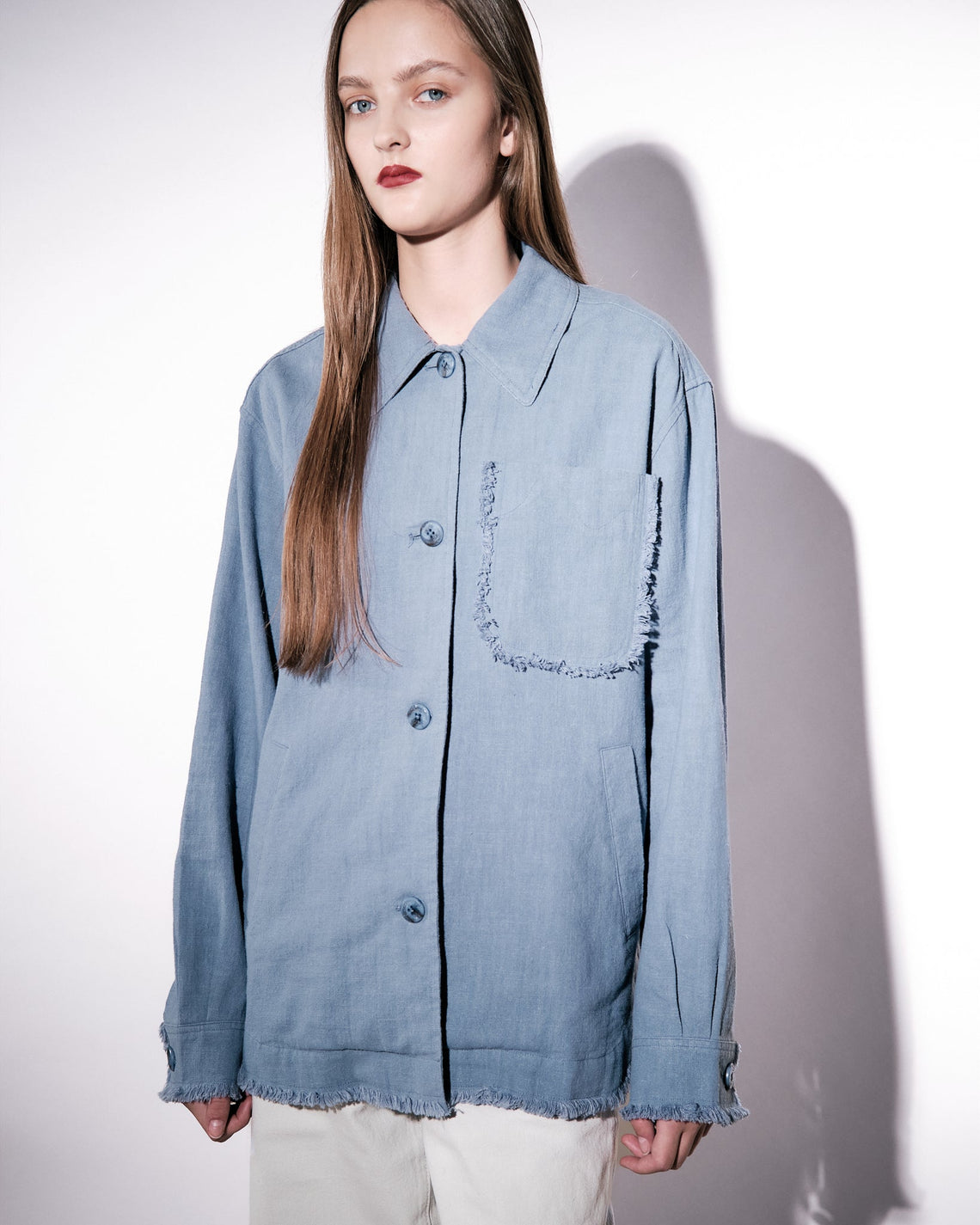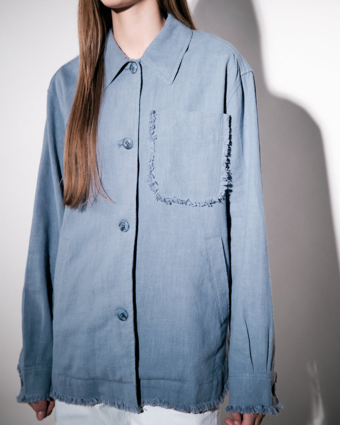 Overshirt tailored in a loose cut for a contemporary silhouette with decorative raw edges. This overshirt is crafted from a linen-cotton blend which has been washed for a soft feel to the touch. Featuring sewn buttons at front closure and cuff with slanted welt pockets at the sides.
