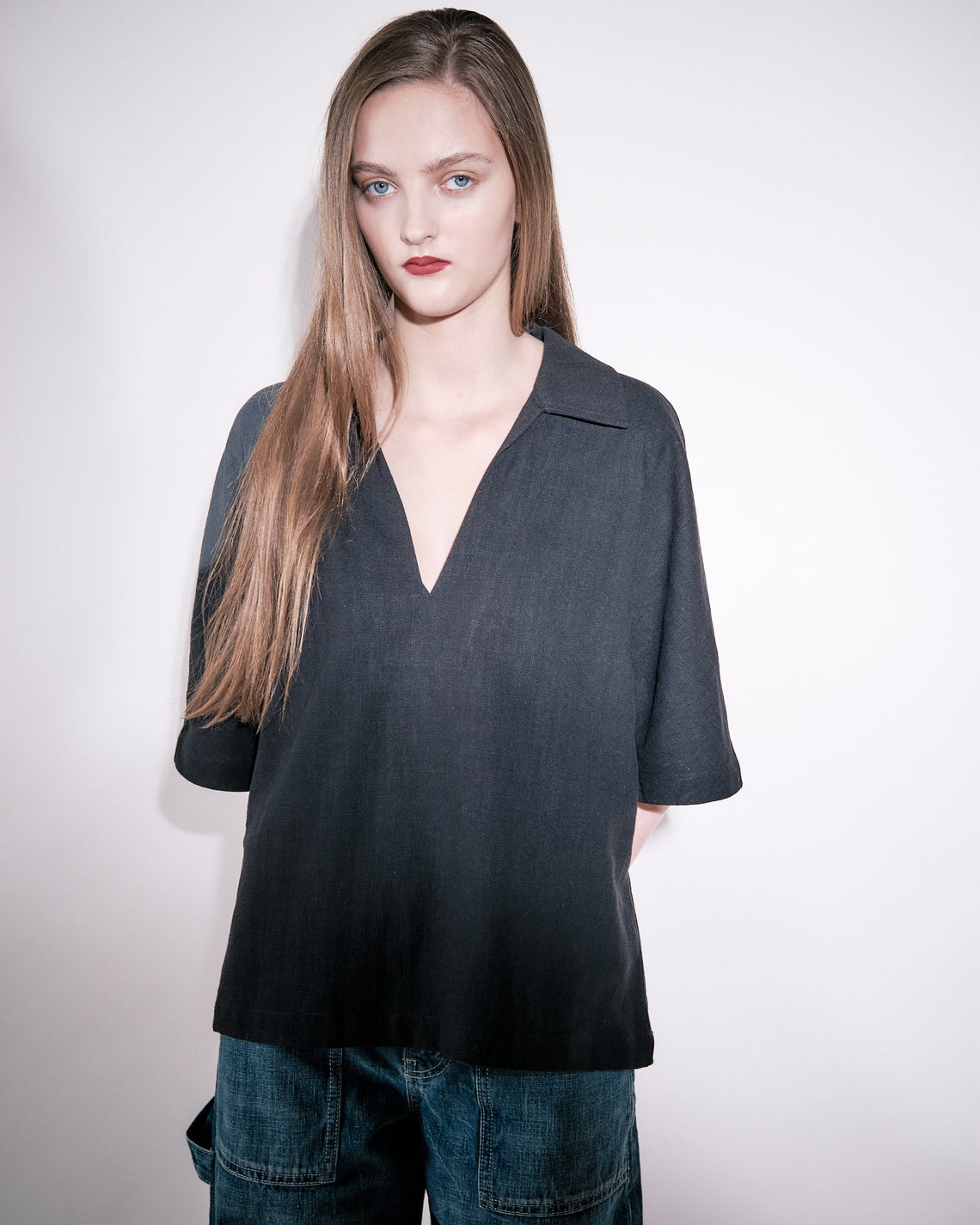 A short sleeved shirt cut in a contemporary loose silhouette crafted from a linen-cotton blend which has been washed for a soft feel to the touch. Featured with a deep v-shaped neckline and a regular collar.