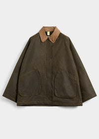 Davonna is an oversized waxed organic cotton jacket in a relaxed, A-line silhouette manufactured in the city of Birminghamn, UK. Features a regular corduroy collar, large curved front pockets, and a concealed snap-button and two way zipper front closure for a clean finish. Water-resistant and wind-repellent, with an additional snap closure in collar for added protection. For a long lasting garment, periodically rewax the shell fabric.