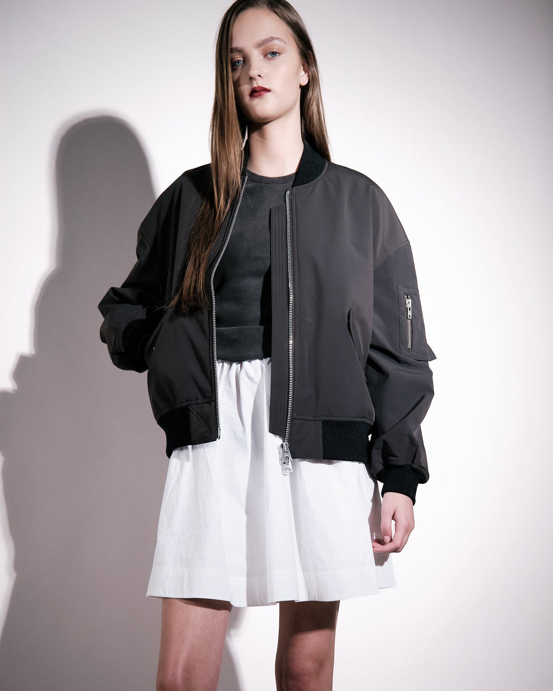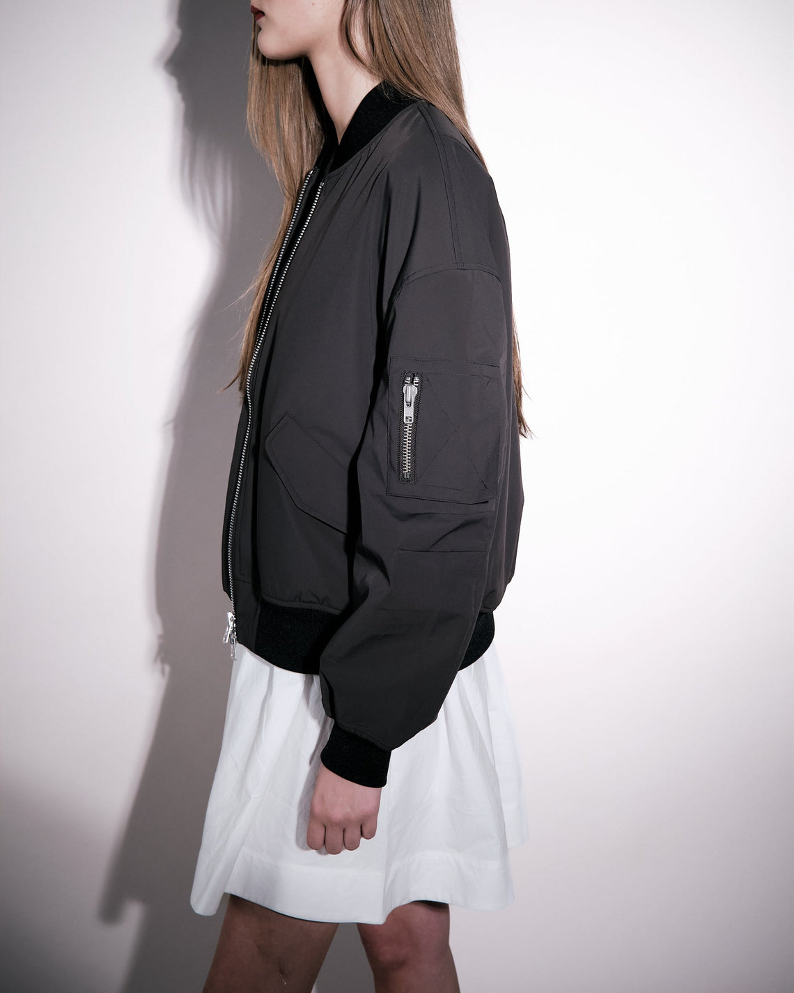 Francesca is a functional waterproof bomber jacket cut in an oversize fit featured with an elastic rib at collar, bottom hem and sleeve end in a tonal colour. The waterproof fabric and padding are both made from recycled polyester and certified under The Global Recycled Standard. Zip pocket on the left sleeve, an inside pocket and side pockets with snap button closures. A boxy fit and rib details flirts with the features of a traditional bomber jacket.