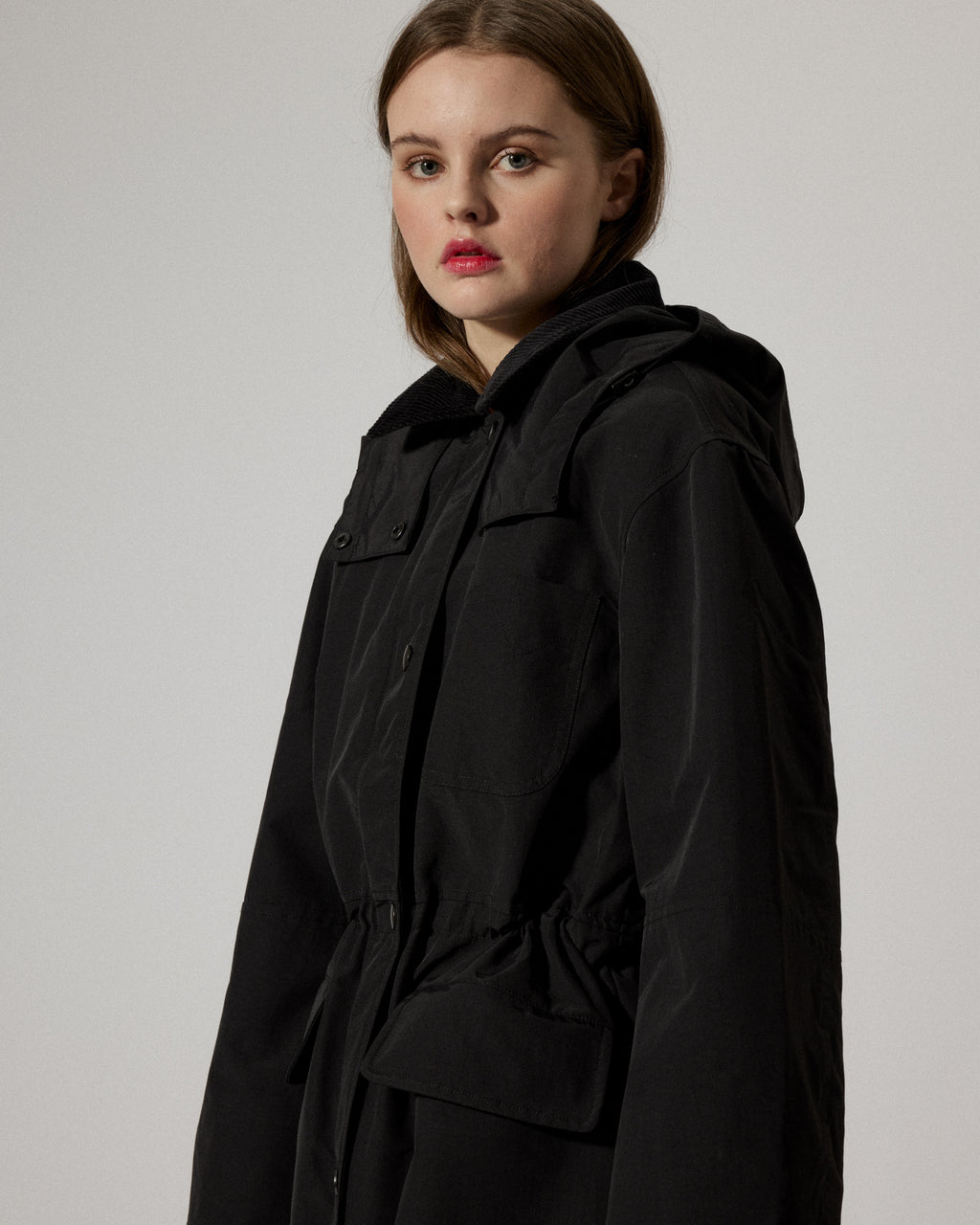 A slightly padded coat crafted from a structured nylon fabric, featuring a concealed two way zip and snap button front closure, an adjustable drawstring at waist for shape, and flap pockets for practicality. A spacious detachable hood for added protection and a contrasting inner collar in corduroy. Shell fabric with membrane and matching taped seams makes this style waterproof.