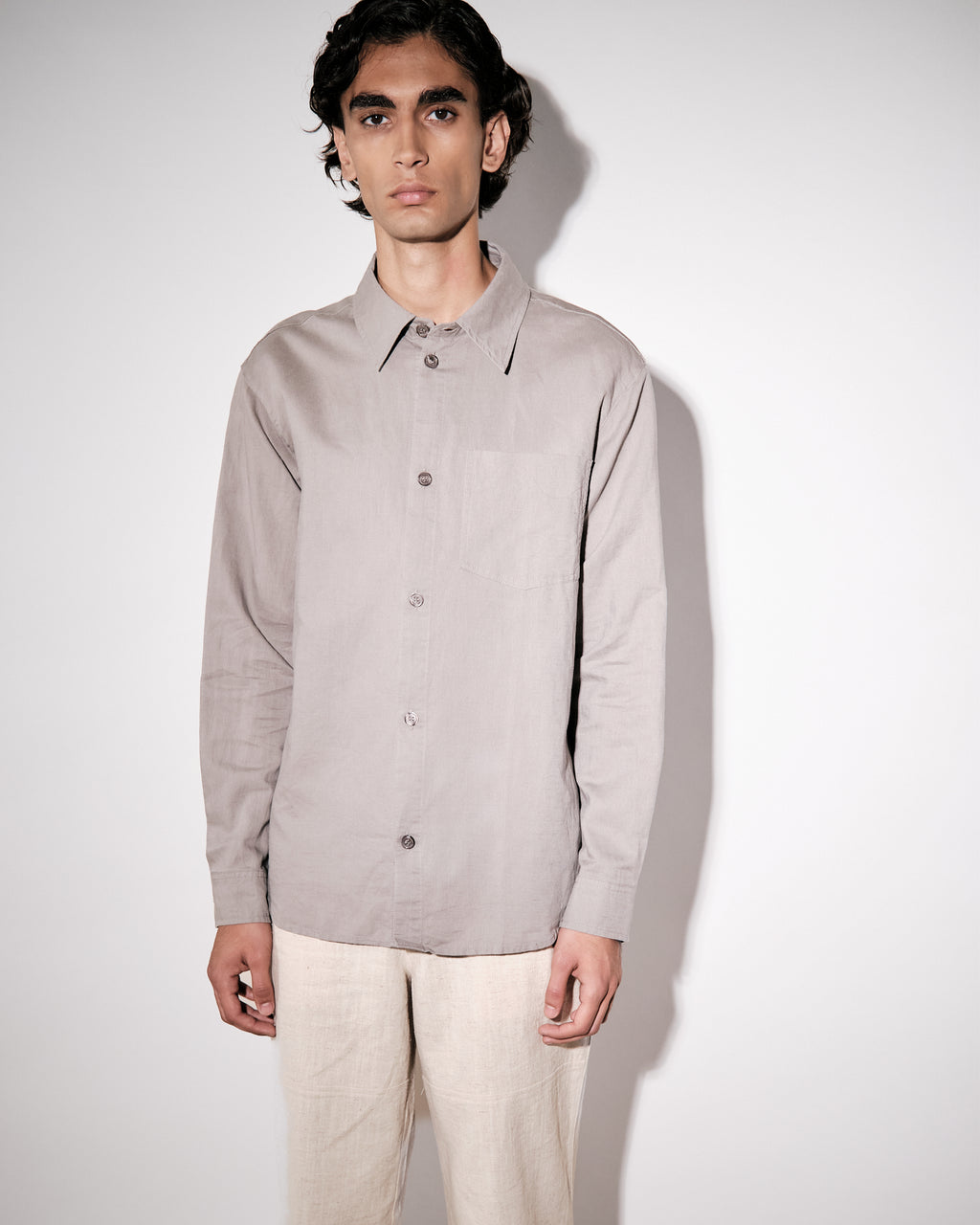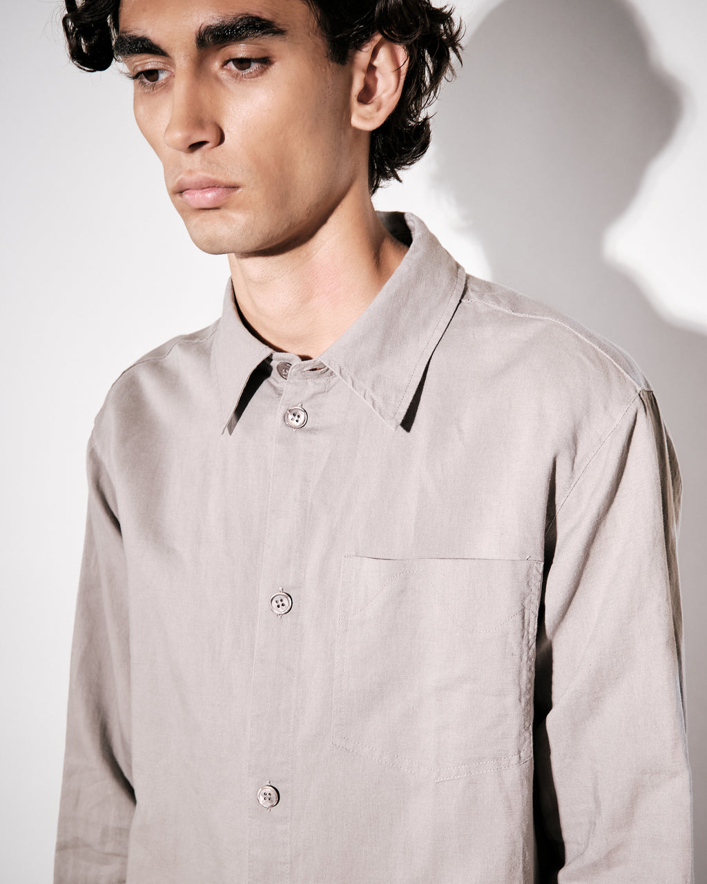 Lawrence is the classic shirt cut in a contemporary loose silhouette crafted from a linen/cotton blend washed for a soft feel to the touch. Featured with sewn mother of pearl buttons at front and cuff, and with an added box pleat below back yoke for added volume.