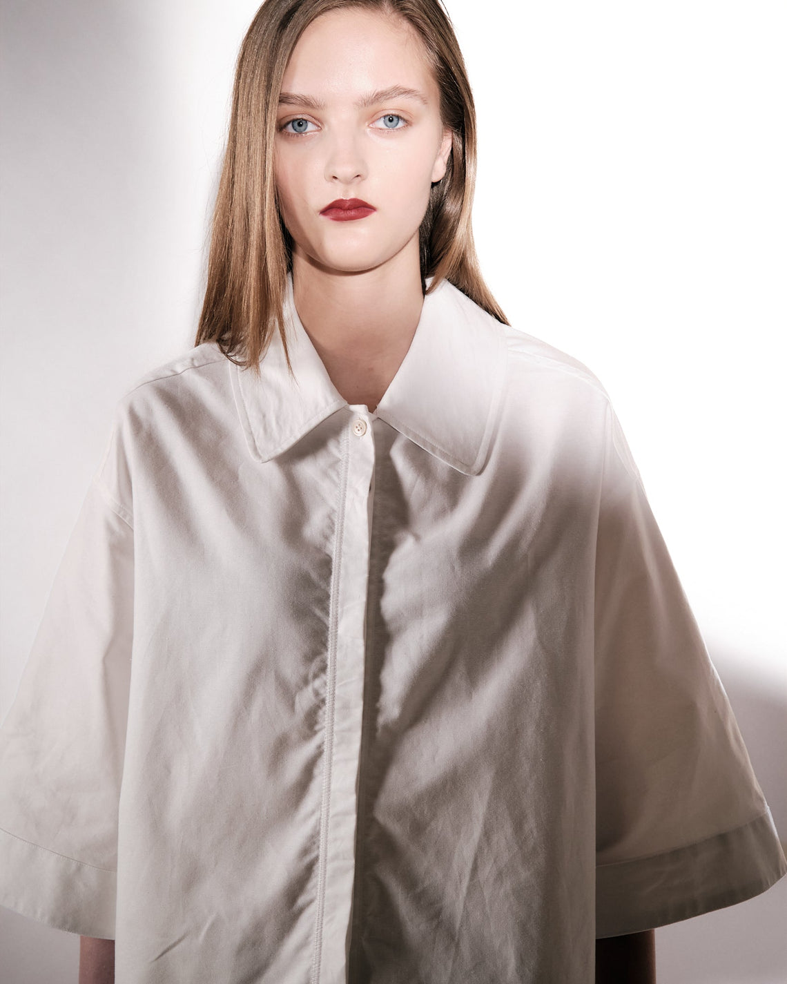 A short sleeved shirt cut in a contemporary loose silhouette crafted from a crispy smooth cotton. Featured with concealed sewn mother of pearl buttons at front and folded sleeve endings.