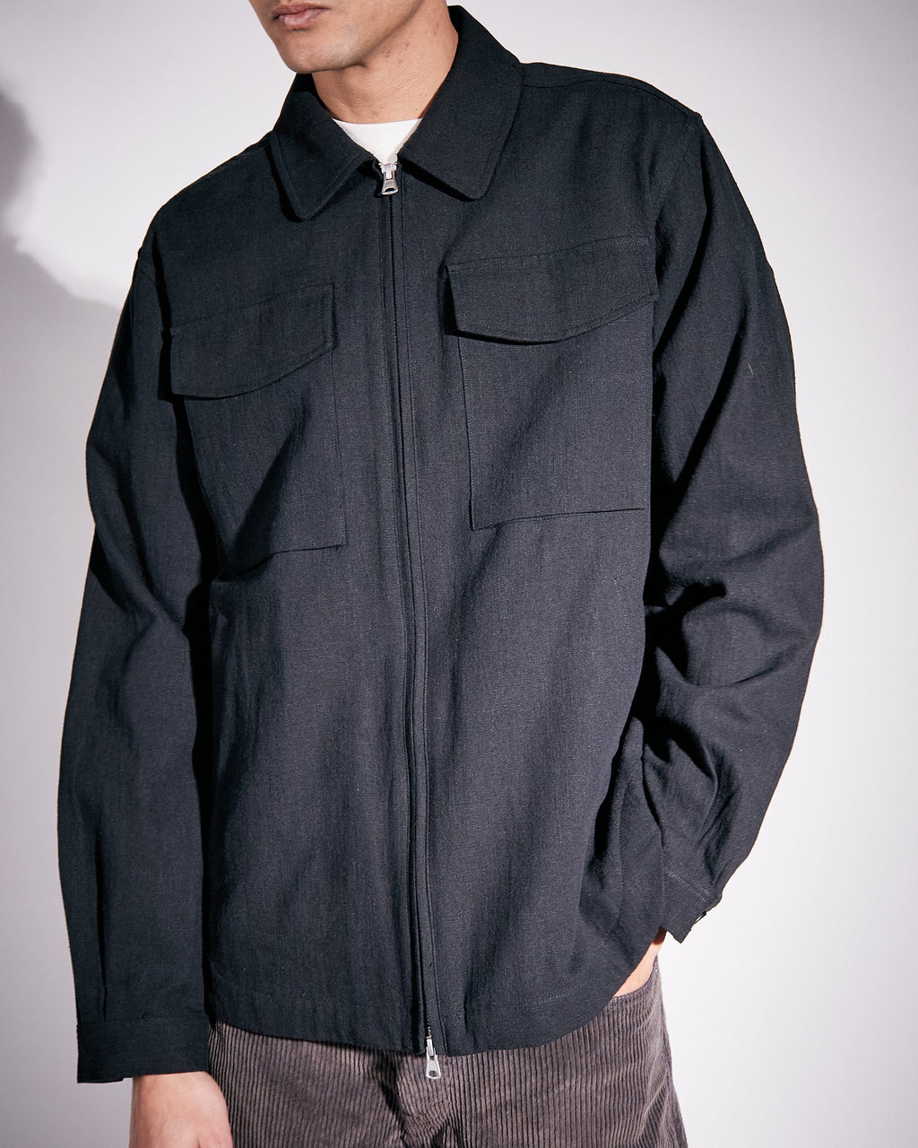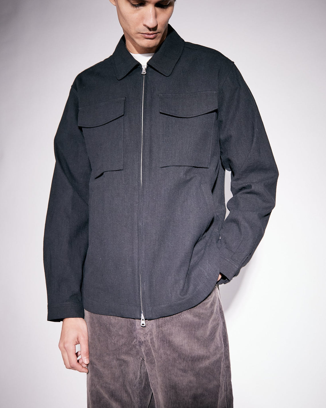 Overshirt tailored in a loose cut for a contemporary silhouette. This overshirt is crafted from a linen/cotton blend which has been washed for a soft feel to the touch. Featuring a two-way zipper at front closure, sewn buttons at cuff and diagonal welt pockets at the sides.