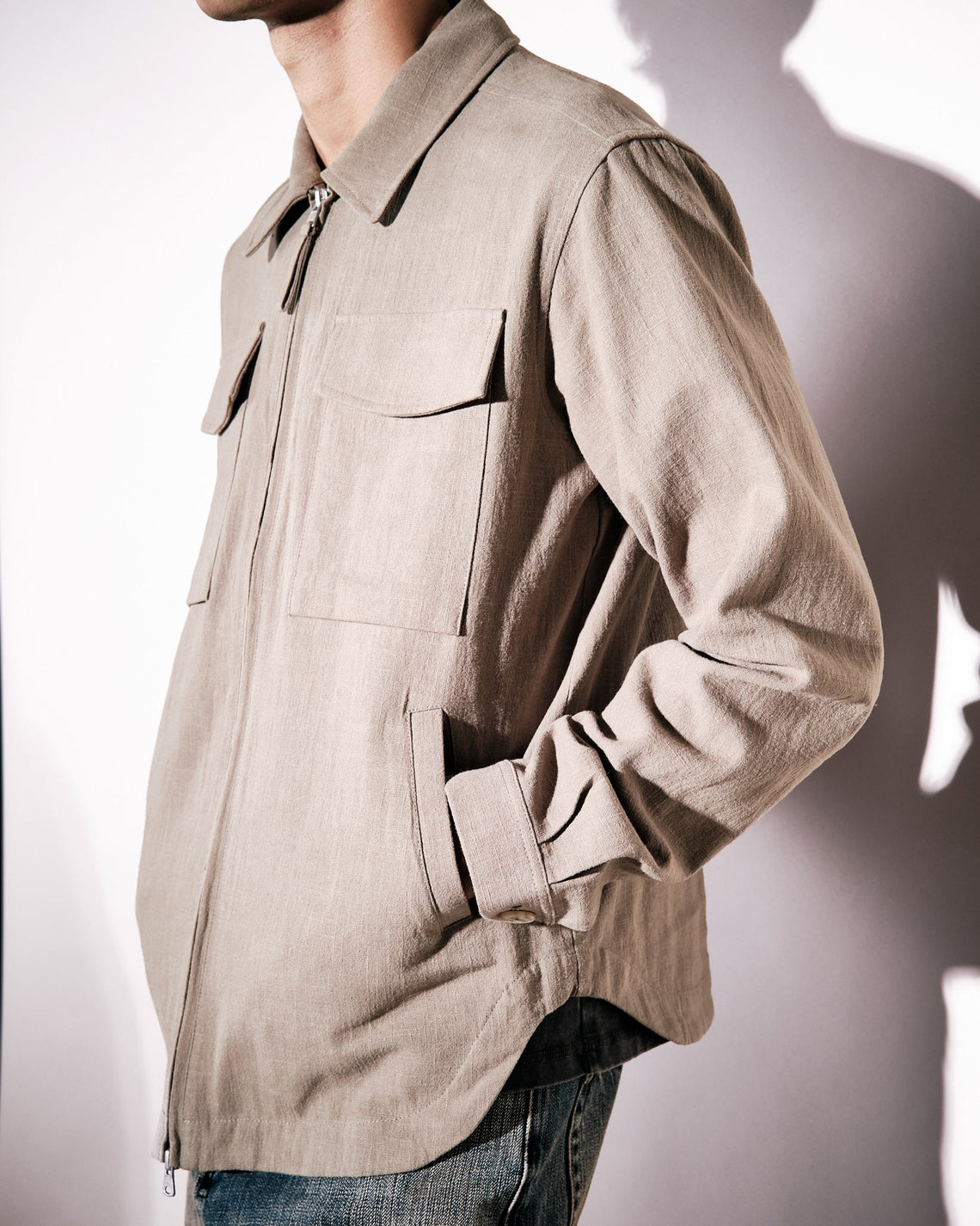 Overshirt tailored in a loose cut for a contemporary silhouette. This overshirt is crafted from a linen/cotton blend which has been washed for a soft feel to the touch. Featuring a two-way zipper at front closure, sewn buttons at cuff and diagonal welt pockets at the sides.