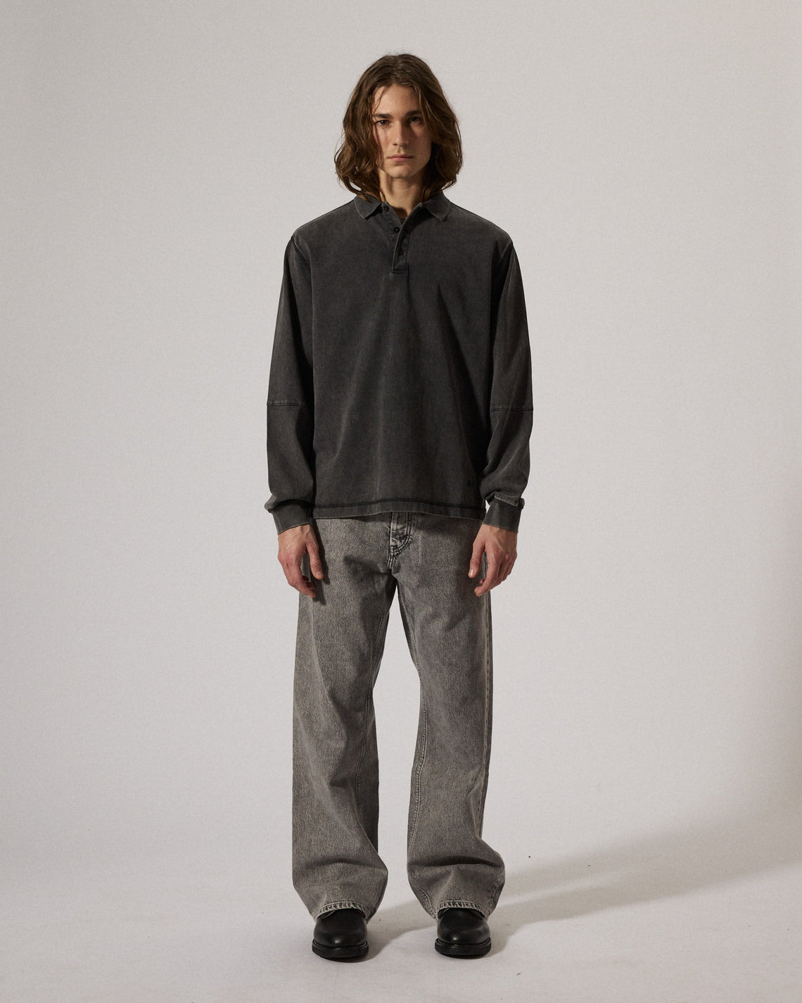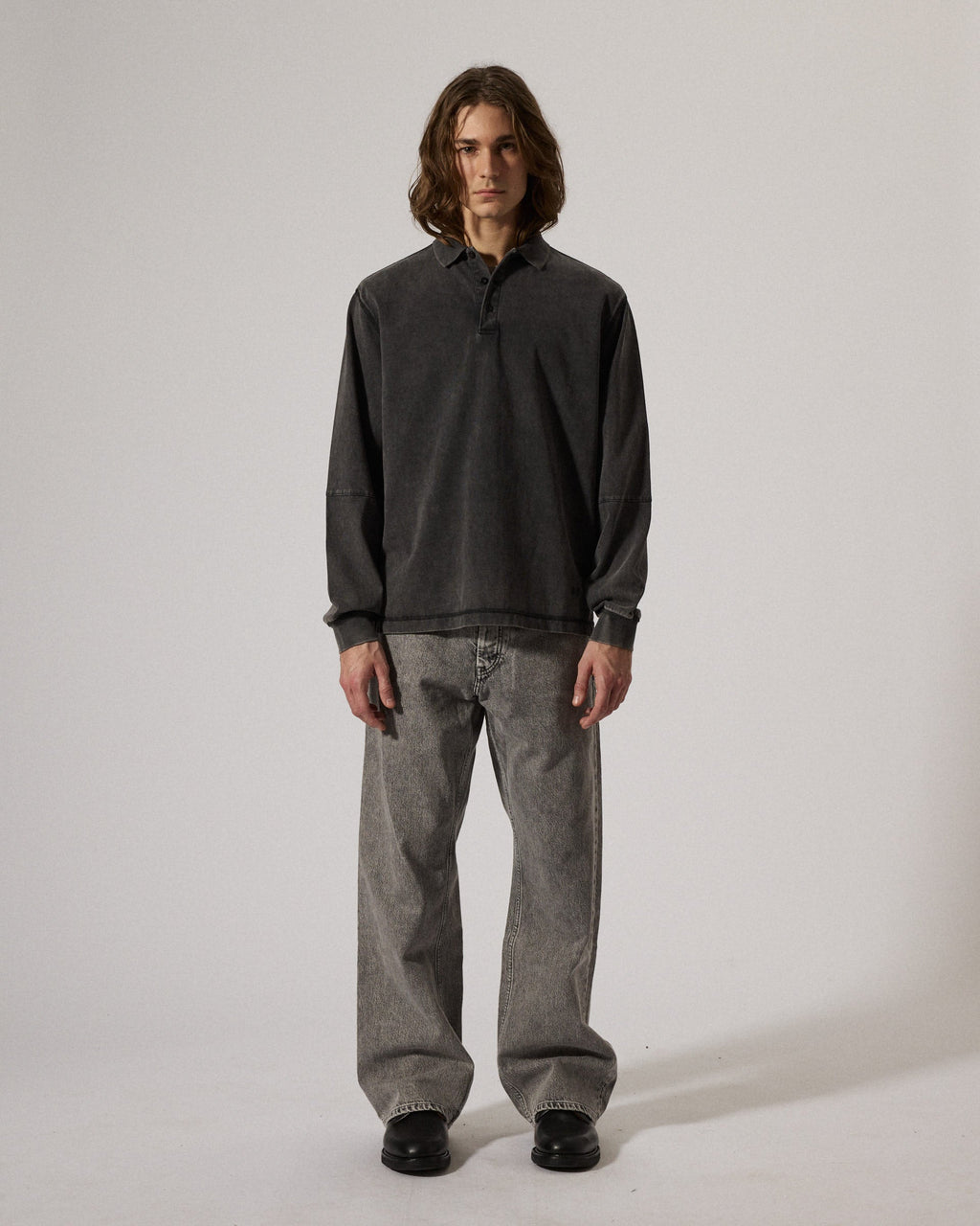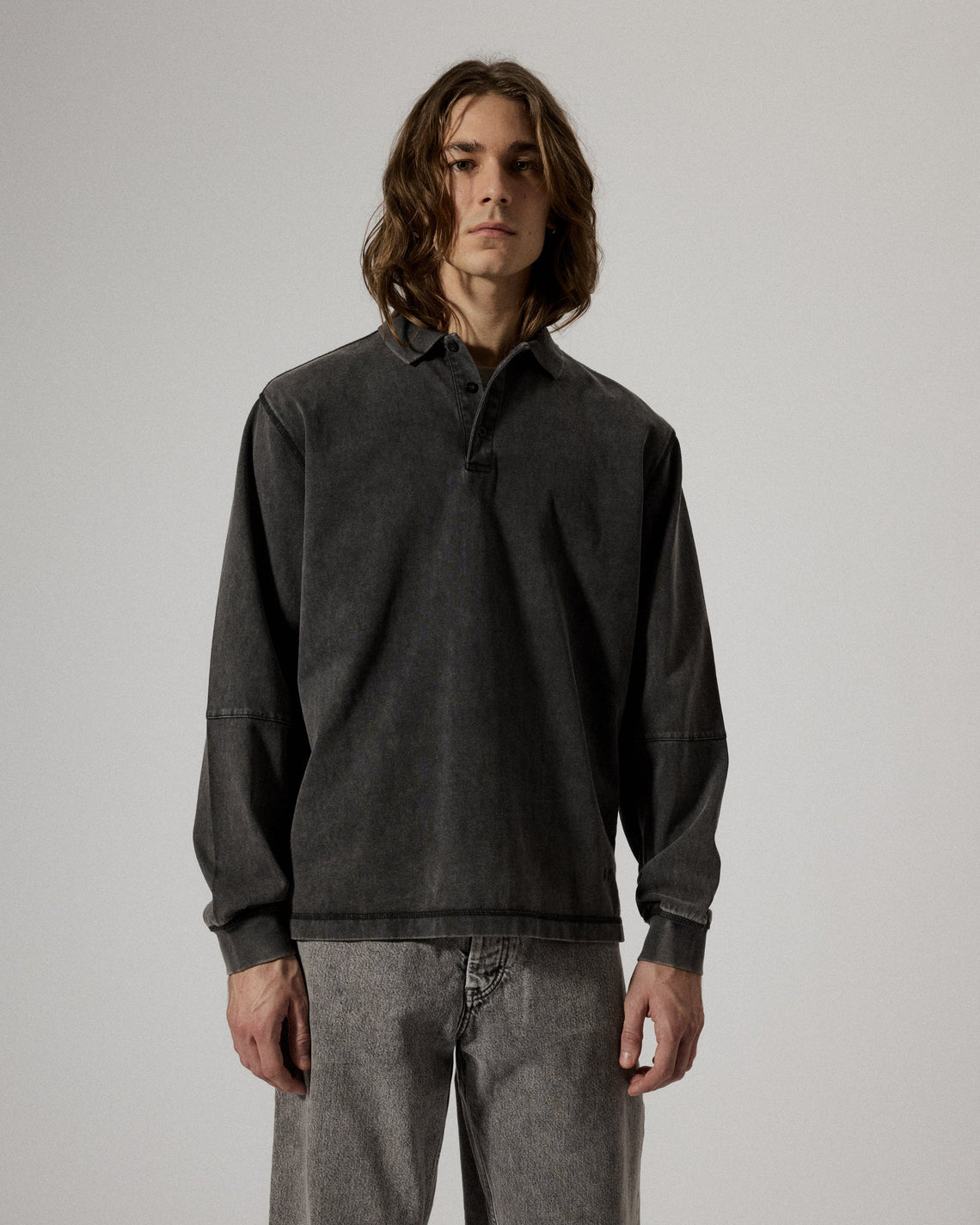 A shirt inspired by the classic rugby shirt cut in a contemporary loose silhouette with a regular collar and a three buttoned half placket. Crafted from soft midweight jersey made from organic cotton and stonewashed for a vintage look. Featured with rib knitted cuffs, decorative seams at elbows and a small monogram embroidery at the left bottom hem.
