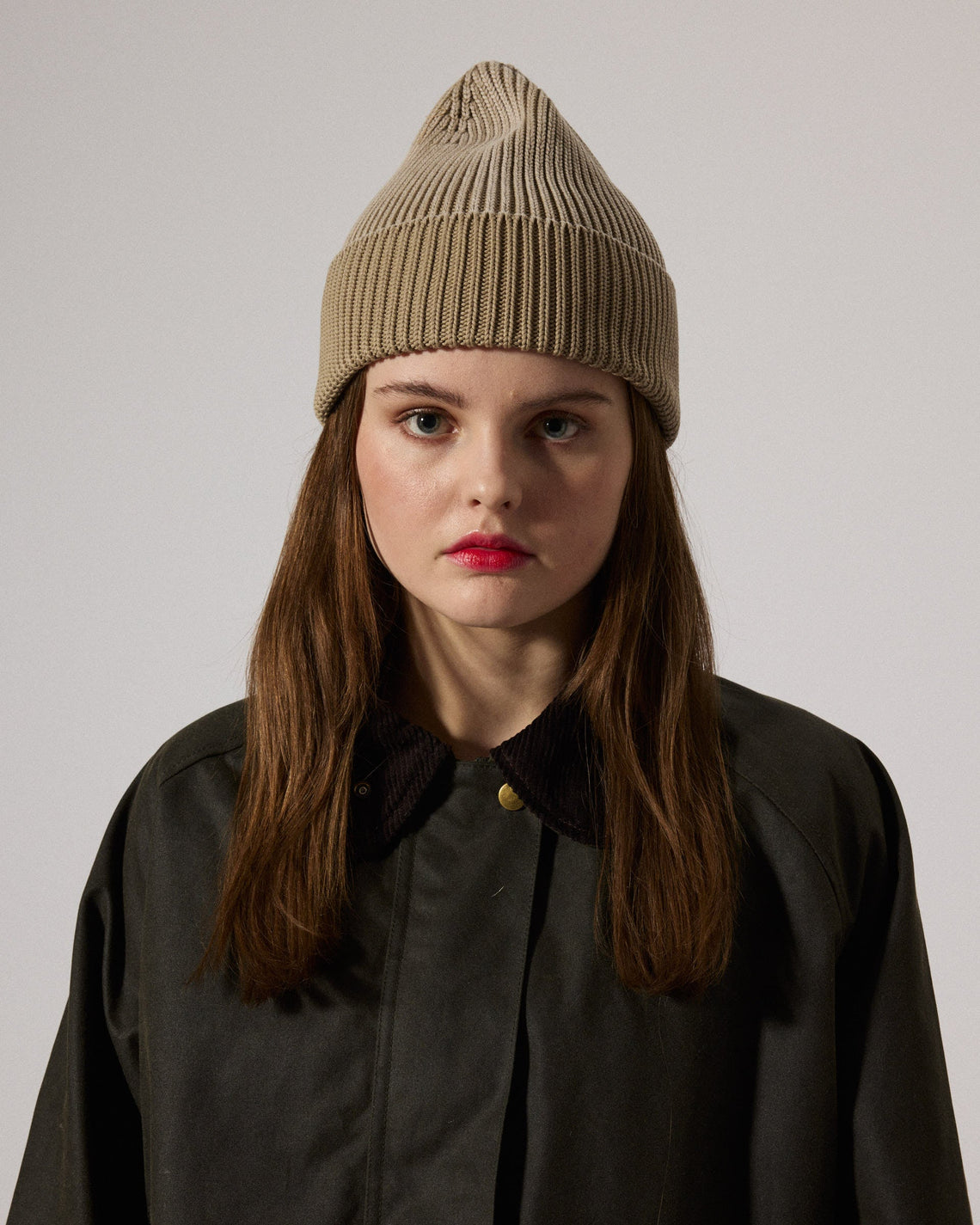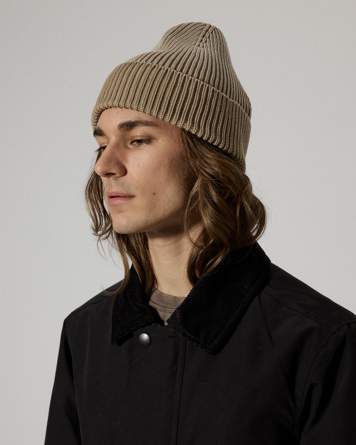 Cotton beanie knitted in a rib stitch made from 100% organic cotton treated with a stonewash for a vintage look, featured with a folded brim. One size fits most. Machine washable.