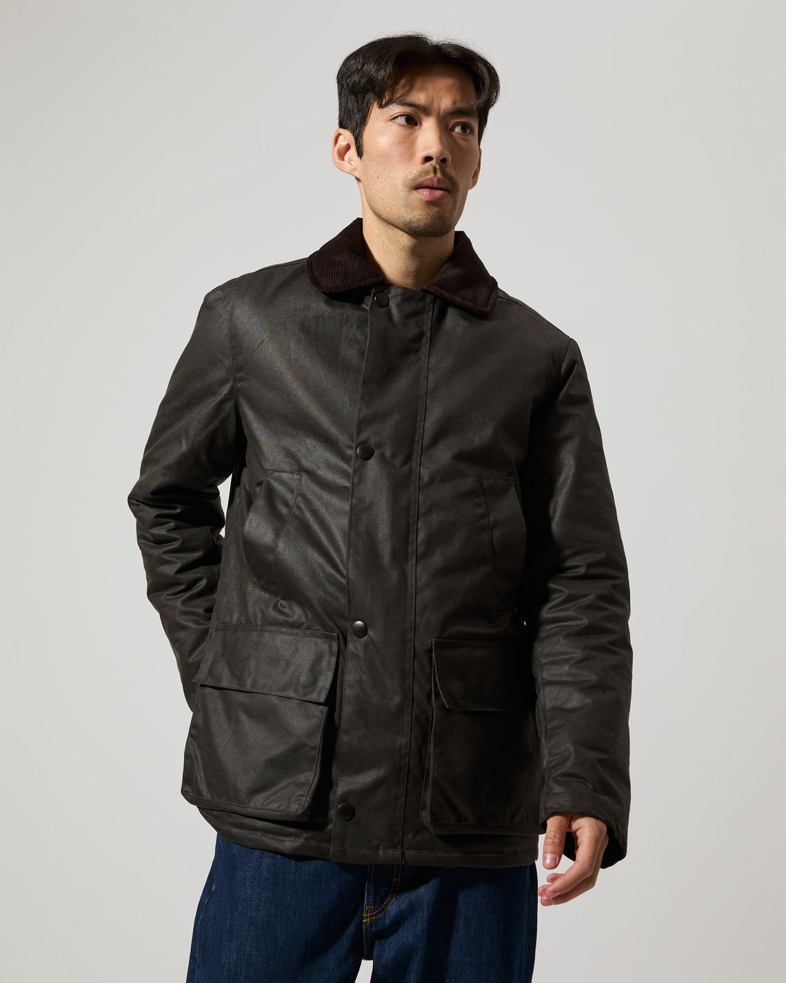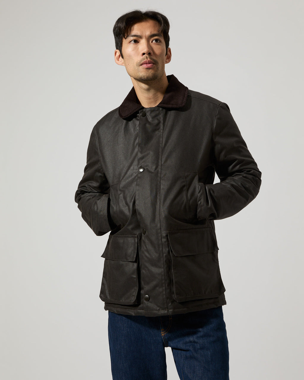 Curtis is a mid-length jacket in a regular fit made from a durable high quality organic cotton treated with a water resistant wax finish in Dundee, Scotland. Features a corduroy collar, snap button closure, two front flap pockets and two slanted welt pockets to keep your hands warm. Manufactured in the city of Birmingham, UK. For a long lasting garment, periodically rewax the shell fabric.