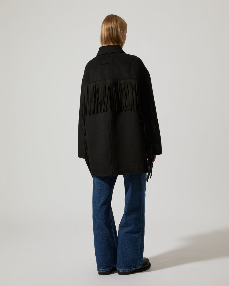 A coat cut at mid length featuring a slightly oversized silhouette with dropped shoulders and sewn buttons at front closure. A row of flowy fringes spans from sleeve end to sleeve end and across the back. The coat is featured with front flap pockets and an inside pocket. Made from a recycled wool blend, certified by the Global Recycle Standard, with a slight brushed finish soft to the touch.
