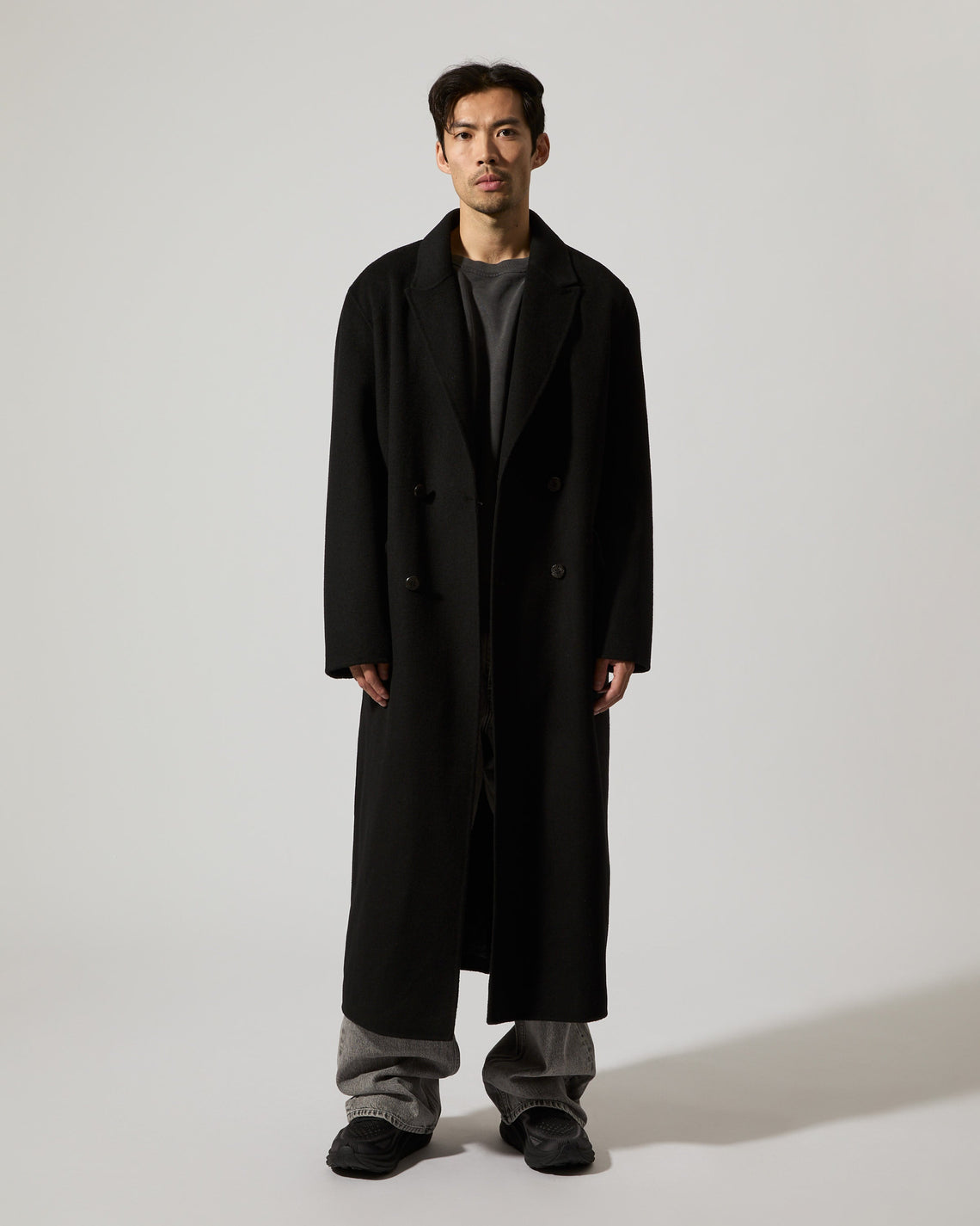 Hugo is an oversize wool coat cut to fall at the ankle, produced in Kaunas, Lithuania. The coat features a long silhouette with wider defined shoulders and detailed with double breasted buttoning at front and flap pockets at the sides. Made from a recycled wool blend, certified by the Global Recycle Standard, with a slight brushed finish soft to the touch.