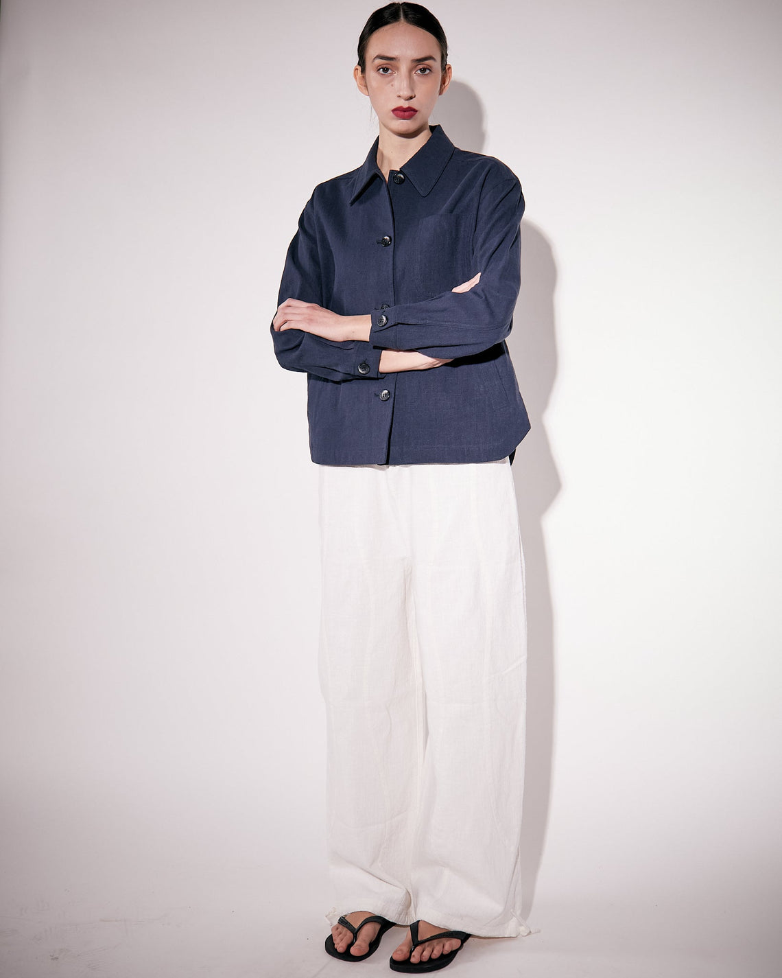 Trousers in loose fit and a mid rise waist, made in a linen/cotton blend which has been washed for a soft feel to the touch. Decorative seams at center front leg. Adjustable pull cords at waist and bottom hem for a versatile look.