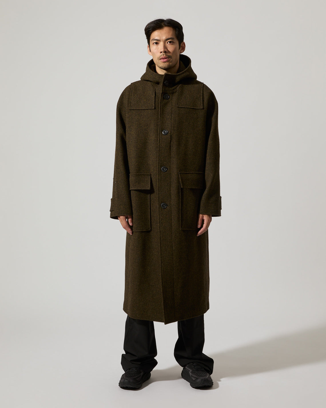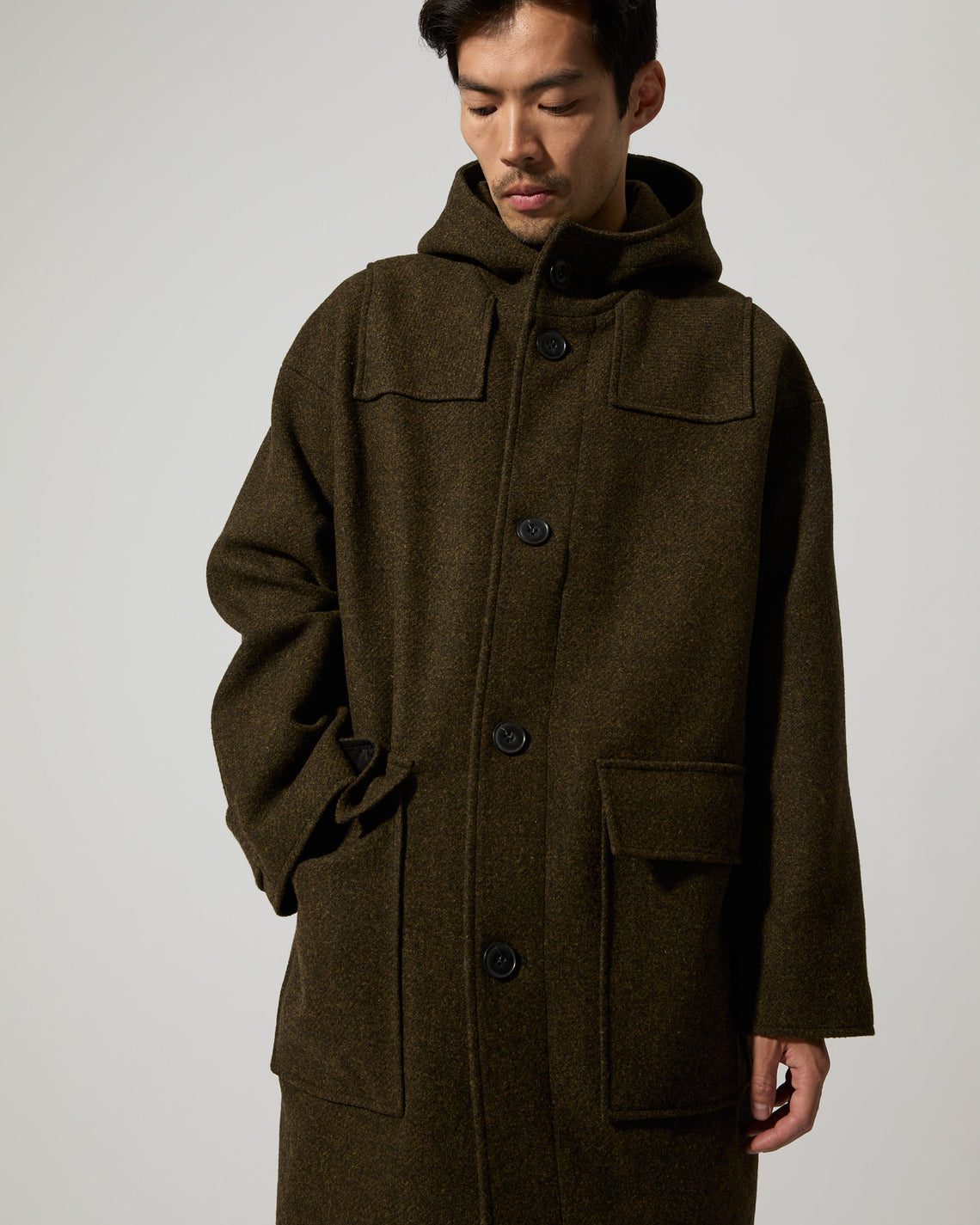 Lachlan is an oversized hooded coat inspired by the classic duffle crafted in a warm high quality Shetland wool, made from a raw wool material with one hundred percent European origin and is woven in a Portugese fabric mill in a deep brown hue. Featuring a full-button front closure, spacious flap pockets, and a clean, tailored cut. The generous hood and the long ankle length adds functional comfort.