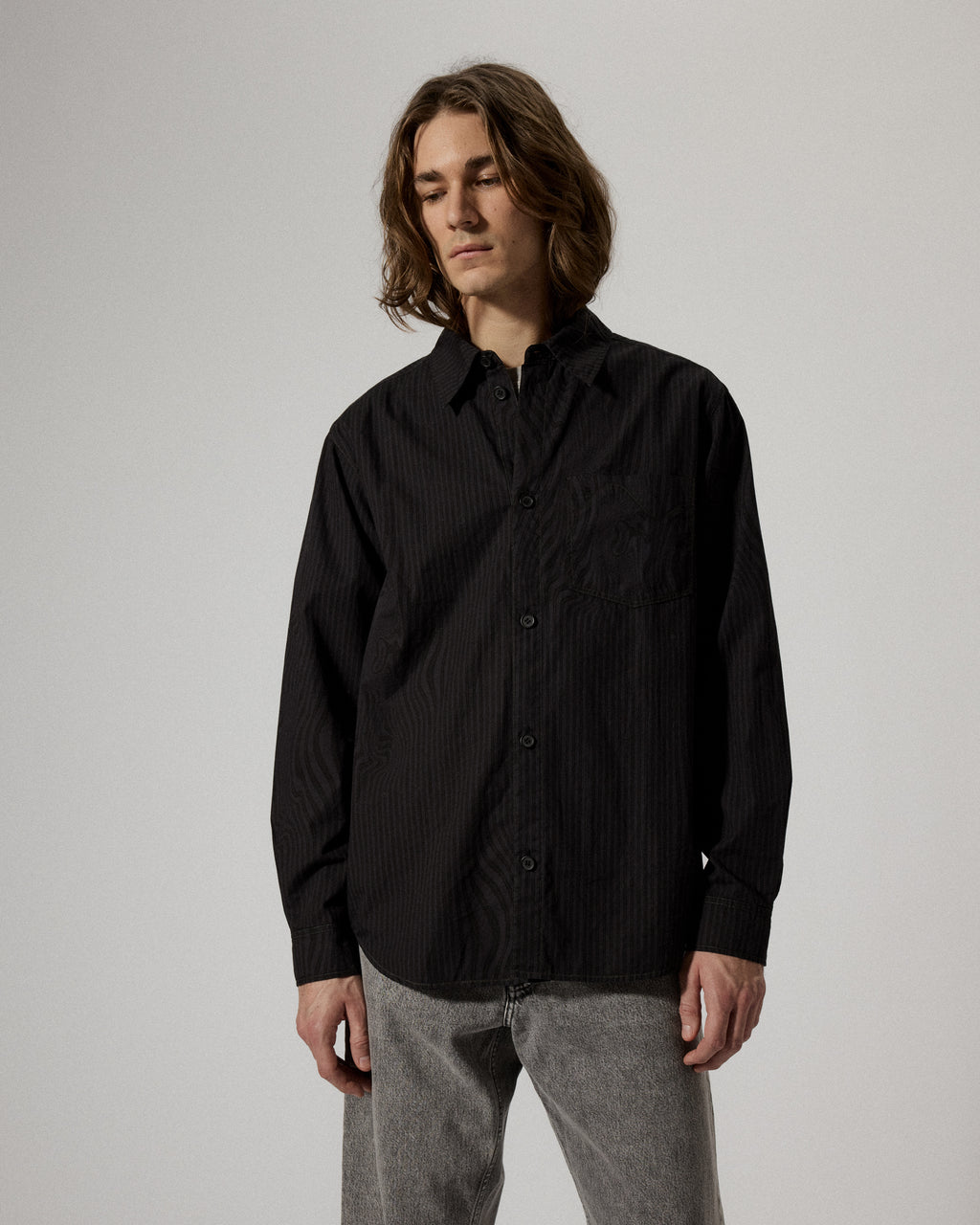 Lawrence is the classic shirt cut in a contemporary loose silhouette crafted from a crispy smooth cotton poplin. Featured with sewn mother of pearl buttons at front and cuff, and with an added box pleat below back yoke for added volume.