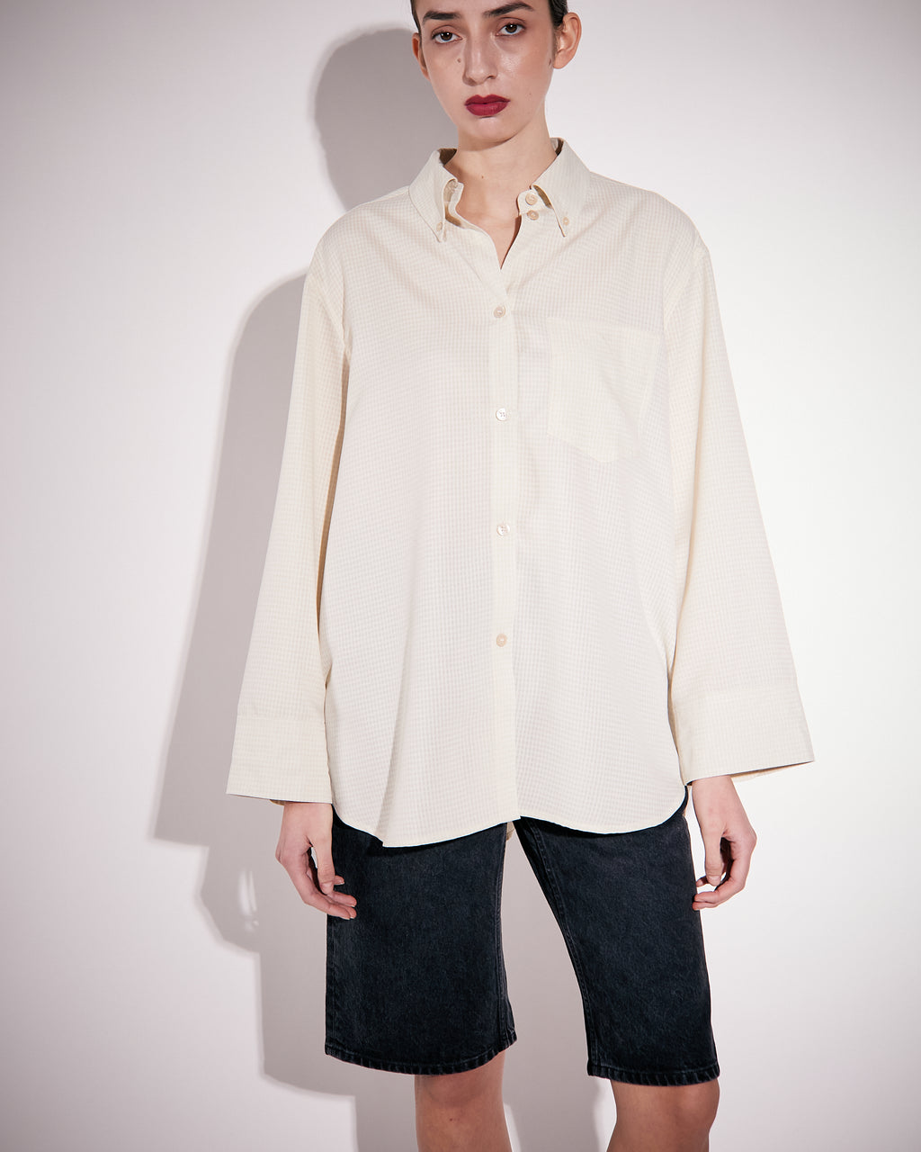 An oversized shirt crafted from a flowy woven polyester quality, cut in a contemporary loose silhouette with a straight slightly wider sleeve. Featured with sewn mother of pearl buttons at front and cuff, and with an added topstitched pleat below back yoke for added detailing.