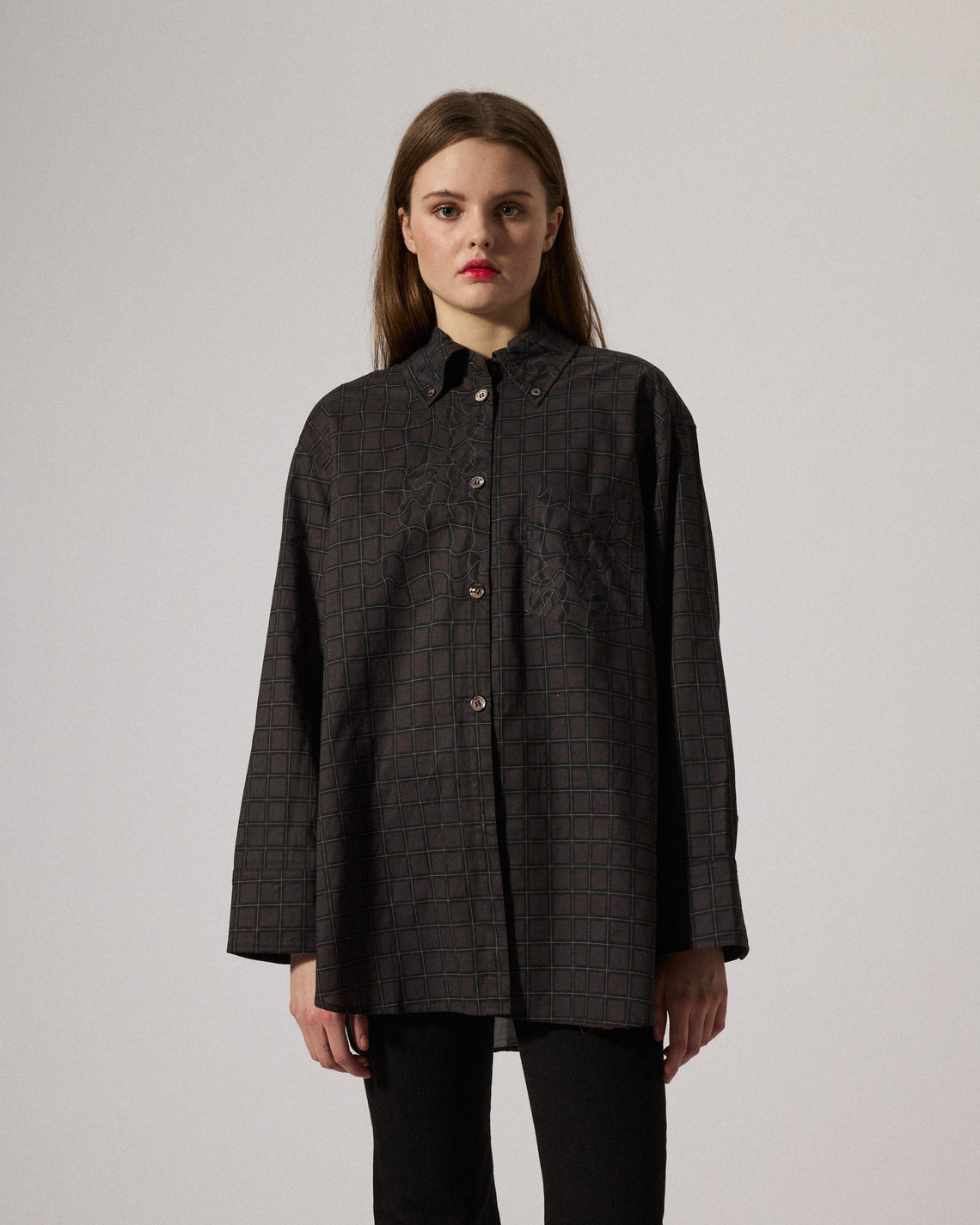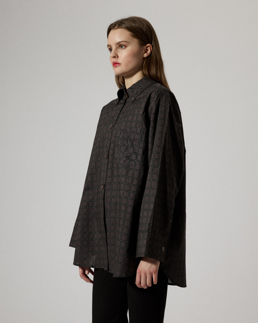 An oversized shirt crafted from a textured and soft washed cotton quality, cut in a contemporary loose silhouette with a straight slightly wider sleeve. Featured with sewn mother of pearl buttons at front and cuff, and with an added topstitched pleat below back yoke for added detailing.