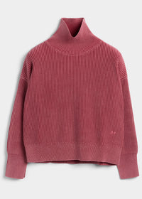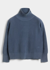 Sage is a funnel neck sweater in a soft high quality organic cotton, knitted in a 5 gauge half cardigan stitch and treated with a stonewash for a vintage look. High standing neck, bottom hem and sleeve endings in a rib knit. Discreet slits at cuff and a small monogram embroidery at the bottom hem.