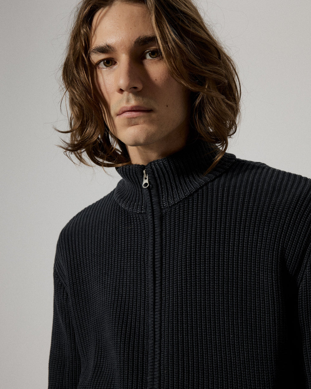 Seven is a cardigan in a soft high quality organic cotton, knitted in a 5 gauge half cardigan stitch treated with a stonewash for a vintage look. Featuring a two-way zip front closure, a high collar, ribbed details and side pockets. Decorative seams across the elbows and a small monogram embroidery at the bottom hem.
