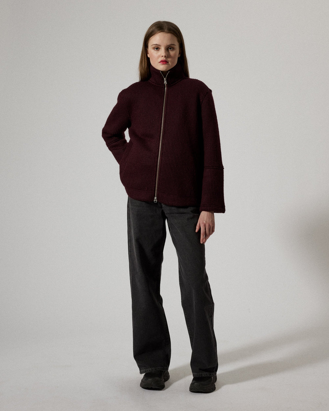 A zip-up cardigan crafted in a textured, warm heavy rib knitted fabric made from recycled fibers certified under the Global Recycle Standard. Featuring a high funnel neck, full front two way zip, and relaxed fit with long sleeves. Side pockets add practicality, while the clean lines and deep hue ensure effortless layering.