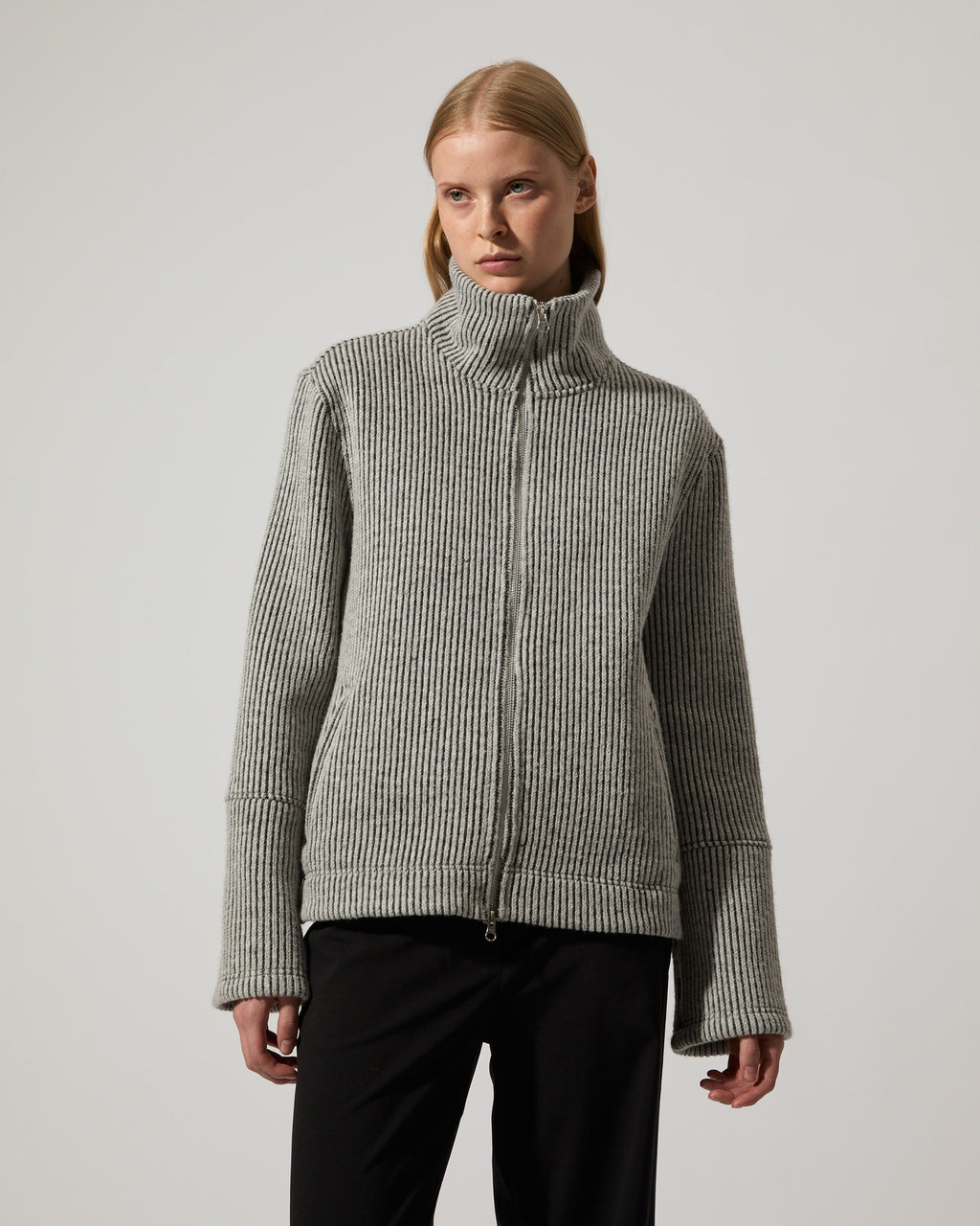 A zip-up cardigan crafted in a textured, warm heavy rib knitted fabric made from recycled fibers certified under the Global Recycle Standard. Featuring a high funnel neck, full front two way zip, and relaxed fit with long sleeves. Side pockets add practicality, while the clean lines and deep hue ensure effortless layering.