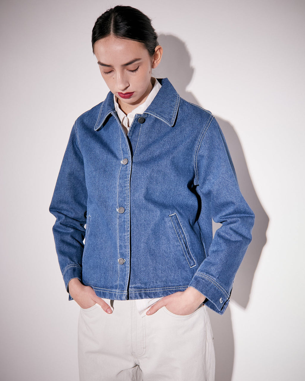 A workwear inspired jacket cut at a shorter length with visible stitching made from an organic cotton denim which has been washed for a soft feel to the touch. Featuring distinctive stitching details and a regular collar. With patch flap pockets and metal jean buttons at front closure and at cuff.