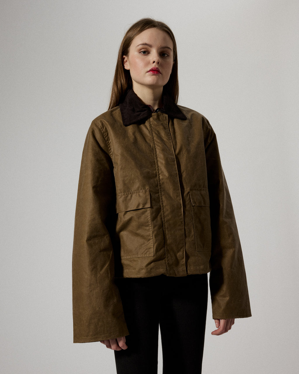 Cropped jacket manufactured in the city of Birminghamn, UK, made from durable waxed organic cotton offering water resistance from Dundee, Scotland. It features a regular collar in corduroy, front flap pockets, and a concealed zip front with a clean, structured silhouette. An additional snap closure in collar for added protection. For a long lasting garment, periodically rewax the shell fabric.