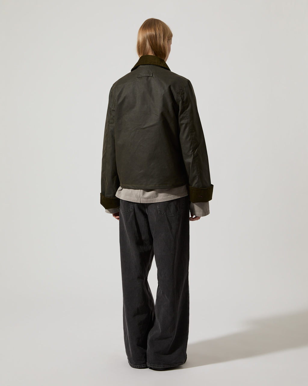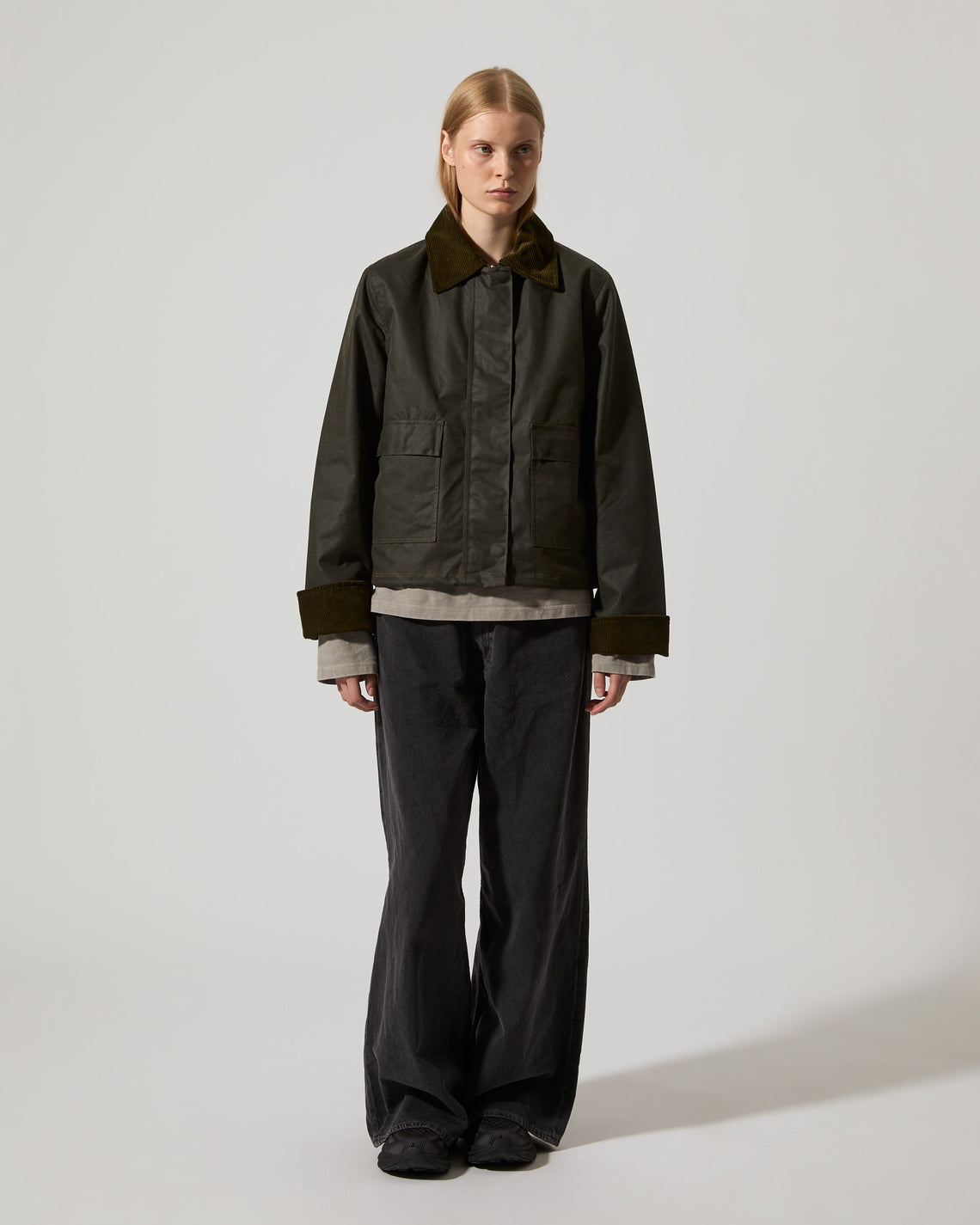 Cropped jacket manufactured in the city of Birminghamn, UK, made from durable waxed organic cotton offering water resistance from Dundee, Scotland. It features a regular collar in corduroy, front flap pockets, and a concealed zip front with a clean, structured silhouette. An additional snap closure in collar for added protection. For a long lasting garment, periodically rewax the shell fabric.